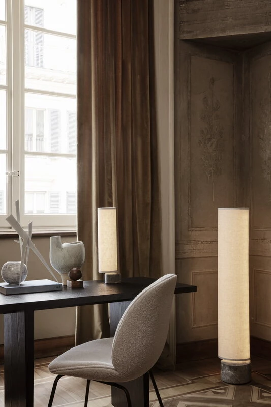 GUBIn Unbound-lattiavalaisin loihtii hienostuneen kodikasta tunnelmaa monenlaisiin sisustuksiin. Muotoilustudio Space Copenhagenin suunnitteleman Unbound-valaisinsarjan muotokieli on saanut vaikutteita japanilaisten lyhtyjen estetiikasta, mikä huokuu erityisesti läpikuultavasta, pellavaisesta varjostimesta. Vastapainoa ja kontrastia keveän kapeaan varjostimeen tuo valaisimen painava, pisaranmuotoinen alusta, joka on valmistettu tukevasta marmorista.
