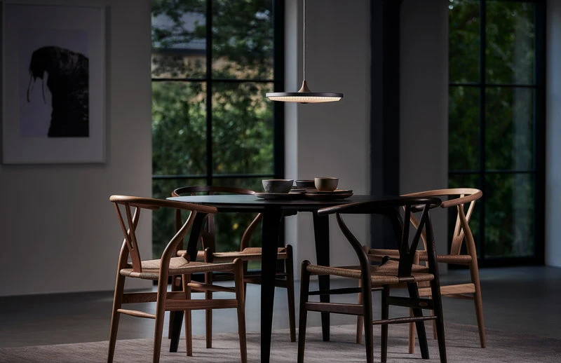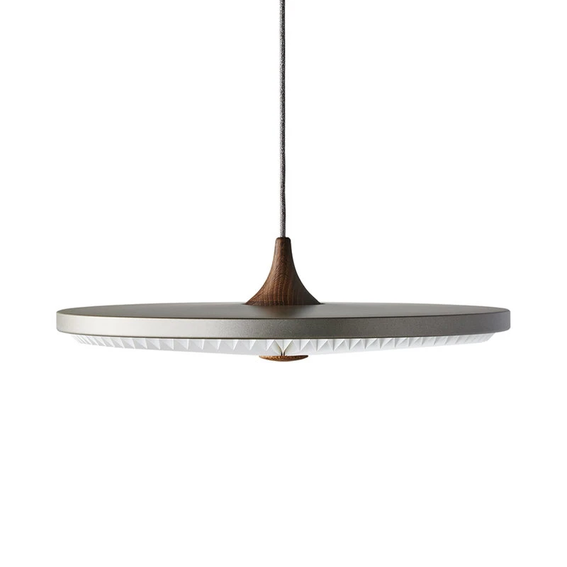 Soleil-valaisimessa laskostettu varjostin yhdistyy litteään alumiinikiekkoon, jonka ansiosta sen ilme on moderni ja erottuva. Viimeisen silauksen kokonaisuuteen antaa tammipuinen ripustusputki varjostimen yllä. Halkaisijaltaan 35 cm:n mittainen valaisin soveltuu niin yksityiskoteihin kuin ravintoloihin ja toimistojen neuvottelutiloihin.