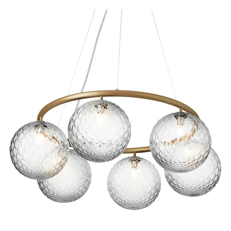 Tanskalaisen Nuuran Miira 6 Circular -riippuvalaisin on moderni kattokruunu, joka kääntää katseet kohokuvioitujen varjostimien luoman tunnelmallisen valon avulla. Kattokruunun renkaan luonteikas metallipinta antaa harkittua kontrastia lasipinnan herkälle ilmeelle. Miira 6 Circular -valaisimen kokonaishalkaisija on 80 cm, ja metallivaijereiden ansiosta voit säätää ripustuskorkeutta 20 ja 250 cm:n välillä.