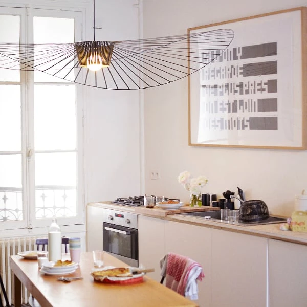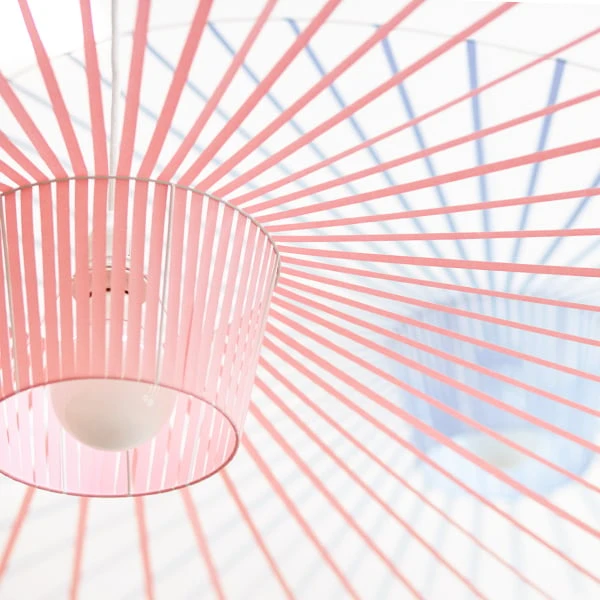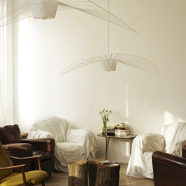 Petite Frituren Vertigo on näyttävä ja suurikokoinen riippuvalaisin, jonka graafinen rakenne luo ympärilleen rytmikkään varjokuvion. Vertigo-valaisimen kevyt, ohuiden nauhojen raidoittama lasikuitukehys keinahtelee ilmavirran mukana ja pysäyttää katseen jo kaukaa. Suunnittelija Constance Guisset’n mukaan kookas varjostin myös jäsentää tilaa ja luo alleen eräänlaisen intiimin sopen. Veistoksellinen Vertigo sopii valaisemaan kaikenlaisia huoneita, mutta on parhaimmillaan lipuessaan suurissa ja korkeissa tiloissa.