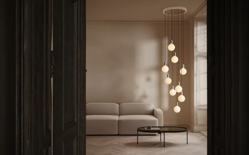 Vaikka Brass Nine -kattokruunu on sinänsä hyvin pelkistetty, tekevät sen mahtipontinen koko ja pallomaiset polttimot kokonaisuudesta suorastaan hypnoottisen. Mattavalkoiset, täydellisen pyöreät Sphere IV -lamput ovat halkaisijaltaan huikeat 15 cm, ja ne näyttävät laskeutuvan katosta kuin valaiseva vesiputous tai sadepisarat. Himmennettävät polttimot on varustettu Dim to Warm -teknologialla, jonka ansiosta valon sävy muuttuu sitä lämpimämmäksi, mitä himmeämmäksi sen tehoa säädetään.